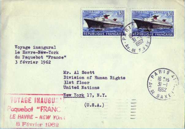 De FRANCE van de Compagnie Générale Transatlantique maakte in februari 1962 haar eerste transatlantische reis. De vleugels aan de schoorstenen dienen om rook en roet vrij van het schip te houden.