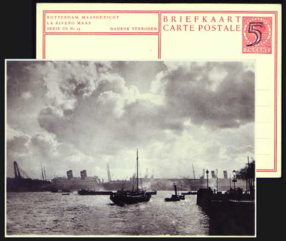 On a cloudy day in the 30s we see moored at Wilhelminakade in Rotterdam at the left the ROTTERDAM (1908) and the VEENDAM or VOLENDAM (1923) and at the right, with three funnels, the STATENDAM waiting for their next trip to New York.