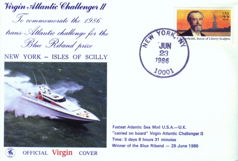 Snelle en luxe schepen konden niet op tegen het vliegtuig, waarmee de strijd om de Blauwe Wimpel beëindigd leek. In 1986 echter wilde Richard Branson van de Virgin Group het record van de UNITED STATES breken met zijn jacht de VIRGIN ATLANTIC CHALLENGER II. Hij verbeterde het record met 2 uur en 9 minuten, maar de raceboot werd niet als een handelsschip beschouwd en de trofee werd niet toegekend.